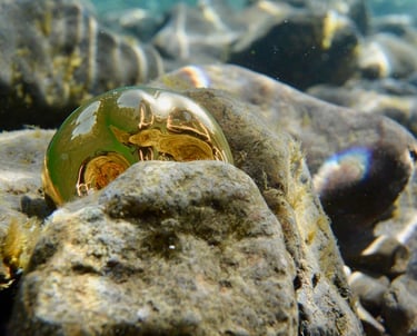 Crystal-clear waters and orange lichen-covered granite boulders.